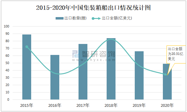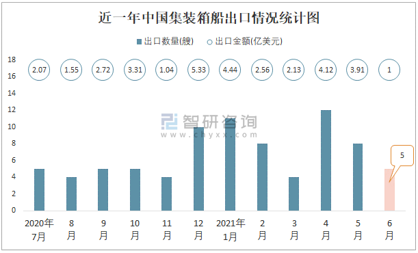 2021年6月中國集裝箱船出口數量為5艘,同比增長400%,出口金額為1億美元,同比增長179.3%;2021年1-6月中國集裝箱船,出口數量為48艘,出口金額為18.16億美元。