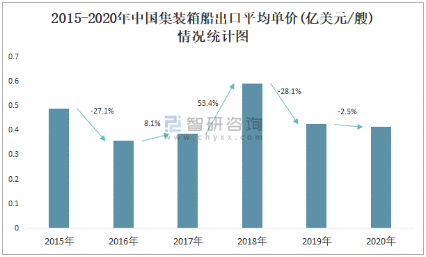 2015-2020年中國集裝箱船出口平均單價(億美元/萬臺)情況統計圖