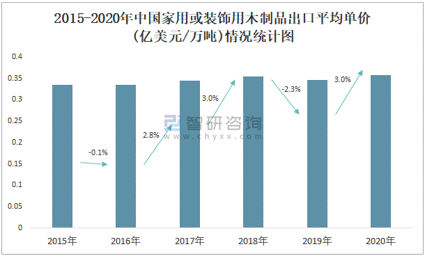 2015-2020年中國家用或裝飾用木制品出口平均單價(億美元/萬臺)情況統計圖