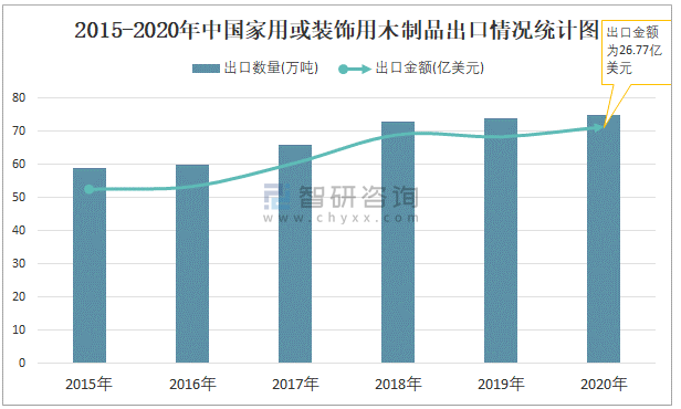 2015-2020年中國家用或裝飾用木制品出口情況統計圖