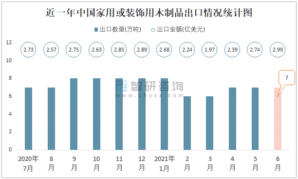 2021年6月中國家用或裝飾用木制品出口數量為7萬噸,同比增長23.2%,出口金額為2.99億美元,同比增長29.4%;2021年1-6月中國家用或裝飾用木制品,出口數量為40萬噸,出口金額為15.02億美元。
