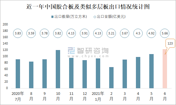 2021年6月中國膠合板及類似多層板出口數量為123萬立方米,同比增長34%,出口金額為5.66億美元,同比增長52.6%;2021年1-6月中國膠合板及類似多層板,出口數量為576萬立方米,出口金額為26.07億美元。