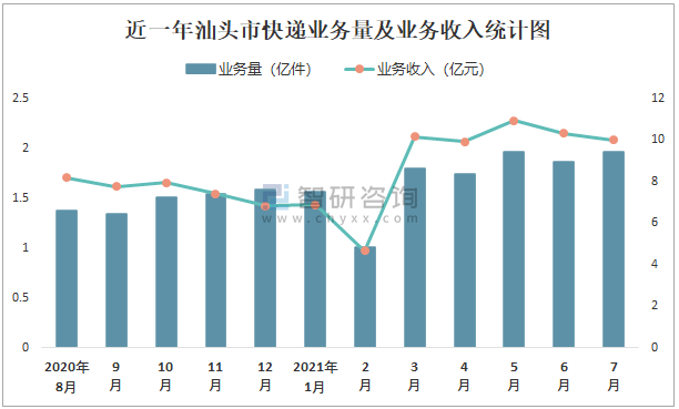近一年汕頭市快遞業(yè)務(wù)量及業(yè)務(wù)收入統(tǒng)計圖