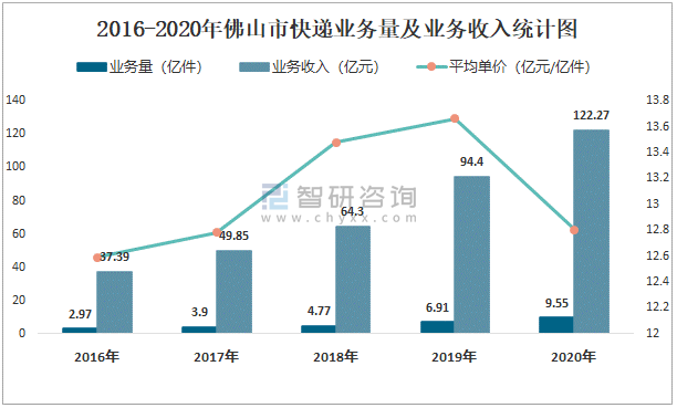 2016-2020年佛山市快遞業務量及業務收入統計圖