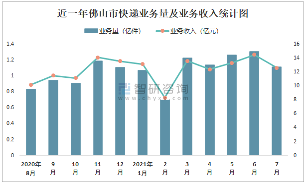 近一年佛山市快遞業務量及業務收入統計圖