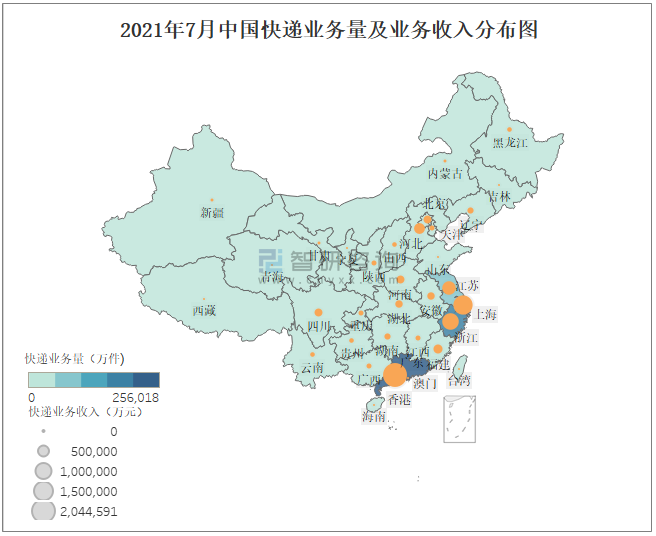 2021年7月中國快遞業務量及業務收入分布圖