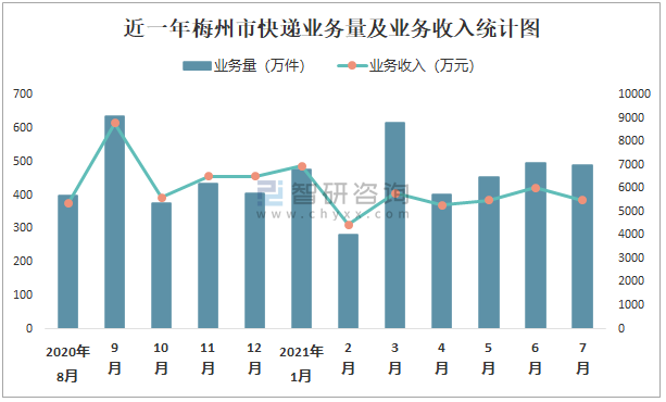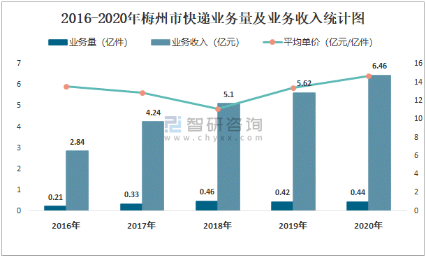 2016-2020年梅州市快遞業務量及業務收入統計圖