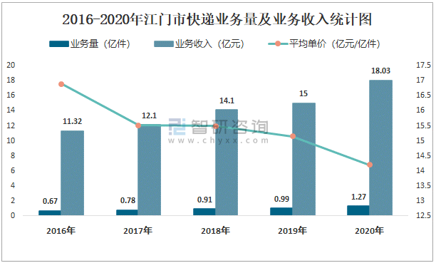 根據(jù)各省市郵政局?jǐn)?shù)據(jù)可知:2021年7月江門市快遞業(yè)務(wù)量為1522.02萬件,業(yè)務(wù)收入為18789.99萬元;2021年1-7月江門市快遞累計(jì)業(yè)務(wù)量為9921.37萬件,同比增長62.6%,累計(jì)業(yè)務(wù)收入為127729.08萬元,同比增長38.67%;2016-2020年江門市快遞業(yè)務(wù)量與業(yè)務(wù)收入均逐年遞增,平均單價(jià)逐年遞減。
