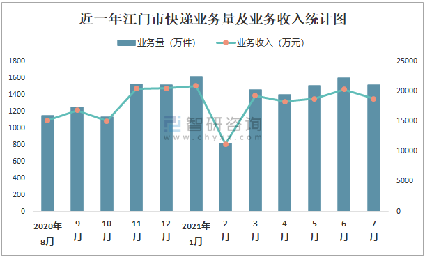 近一年江門市快遞業(yè)務(wù)量及業(yè)務(wù)收入統(tǒng)計(jì)圖