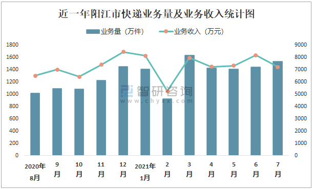 近一年陽江市快遞業(yè)務(wù)量及業(yè)務(wù)收入統(tǒng)計圖