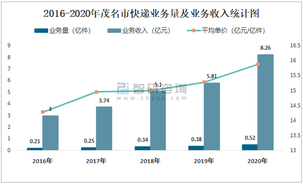 2016-2020年茂名市快遞業務量及業務收入統計圖
