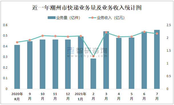近一年潮州市快遞業務量及業務收入統計圖