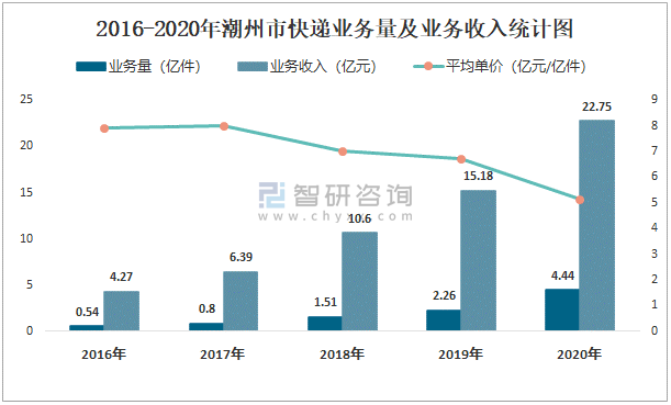 2016-2020年潮州市快遞業務量及業務收入統計圖