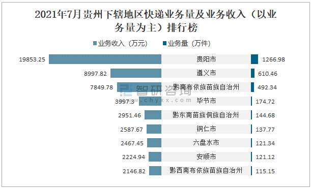 2021年7月貴州下轄地區快遞業務量及業務收入(以業務量為主)排行榜