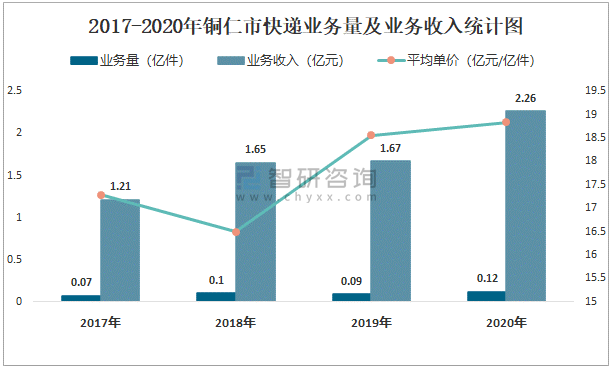 2017-2020年銅仁市快遞業務量及業務收入統計圖