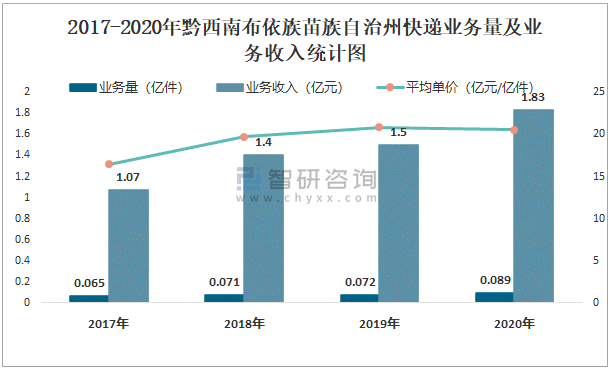 2017-2020年黔西南布依族苗族自治州快遞業務量及業務收入統計圖