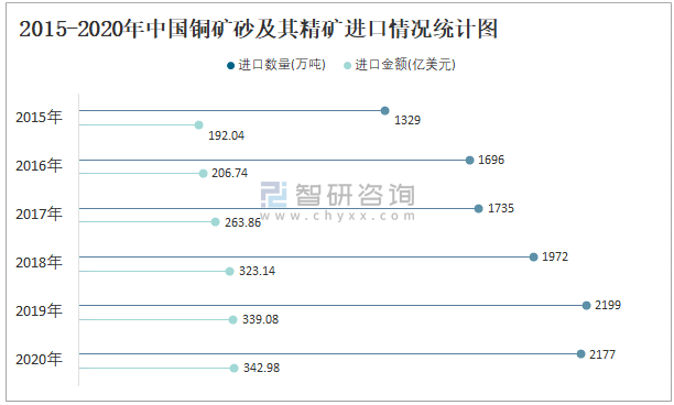 2015-2020年中國銅礦砂及其精礦進口情況統計圖
