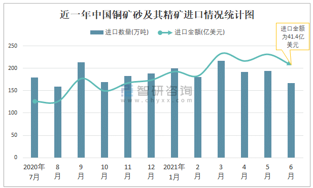 根據中國海關數據顯示:2021年6月中國銅礦砂及其精礦進口數量為167萬噸,同比增長5%,進口金額為41.4億美元,同比增長63.6%,2021年1-6月中國銅礦砂及其精礦進口數量為1150萬噸,進口金額為257.04億美元。