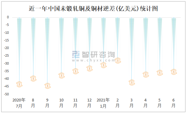 近一年中國(guó)未鍛軋銅及銅材逆差(億美元)統(tǒng)計(jì)圖