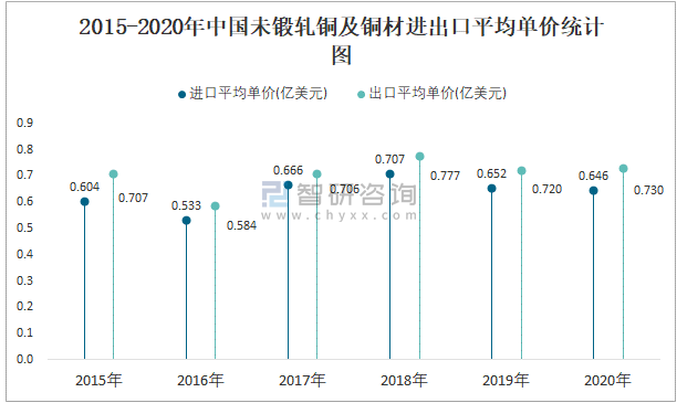 2015-2020年中國(guó)未鍛軋銅及銅材進(jìn)出口平均單價(jià)統(tǒng)計(jì)圖