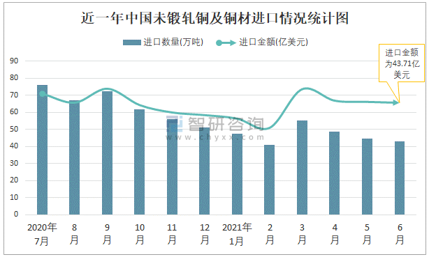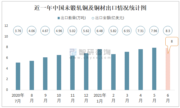 根據(jù)中國(guó)海關(guān)數(shù)據(jù)顯示:2021年6月中國(guó)未鍛軋銅及銅材進(jìn)口數(shù)量為42.84萬(wàn)噸,同比下降34.7%,進(jìn)口金額為43.71億美元,同比增長(zhǎng)14%,2021年6月中國(guó)未鍛軋銅及銅材出口數(shù)量為7.87萬(wàn)噸,同比增長(zhǎng)58%,出口金額為8.3億美元,同比增長(zhǎng)132.4%;2021年1-6月中國(guó)未鍛軋銅及銅材進(jìn)口數(shù)量為279.48萬(wàn)噸,進(jìn)口金額為253.15億美元,出口數(shù)量為44.81萬(wàn)噸,出口金額為42.39億美元。