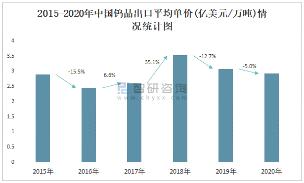 2015-2020年中國鎢品出口平均單價(億美元/萬臺)情況統計圖