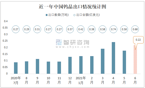 2021年6月中國鎢品出口數量和出口金額分別為0.22萬噸和0.68億美元