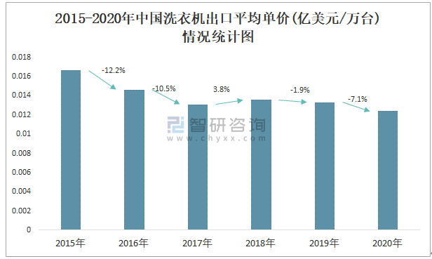 2015-2020年中國洗衣機出口平均單價(億美元/萬臺)情況統計圖