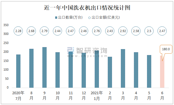 2021年6月中國洗衣機出口數量為180萬臺,同比增長13.3%,出口金額為2.47億美元,同比增長24.2%;2021年1-6月中國洗衣機,出口數量為1159萬臺,出口金額為15.66億美元。