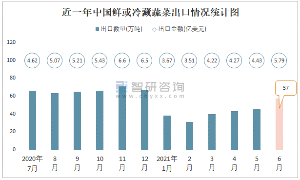 2021年6月中國鮮或冷藏蔬菜出口數(shù)量為57萬噸,同比下降4.8%,出口金額為5.79億美元,同比增長48.2%;2021年1-6月中國鮮或冷藏蔬菜,出口數(shù)量為255萬噸,出口金額為25.89億美元。