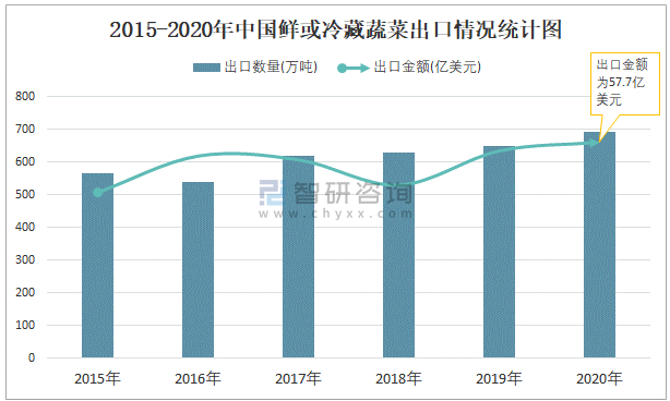 2015-2020年中國鮮或冷藏蔬菜出口情況統(tǒng)計(jì)圖