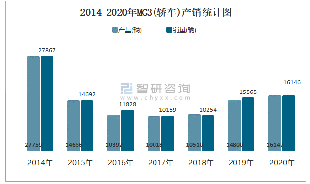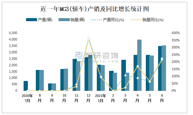 根據中國汽車工業協會數據可知:2021年6月MG3(轎車)產量為3472輛,同比增長224.2%,銷量為3511輛,同比增長217.2%,當月產銷率為101.12%;2021年上半年MG3(轎車)產量為14923輛,同比增長126.6%,銷量為14925輛,同比增長126.6%,產銷率為100.01%;2014-2020年MG3(轎車)產銷量均在2017年跌至最低值,此后逐年遞增,且近7年總銷量大于總產量,清倉庫存2249輛。