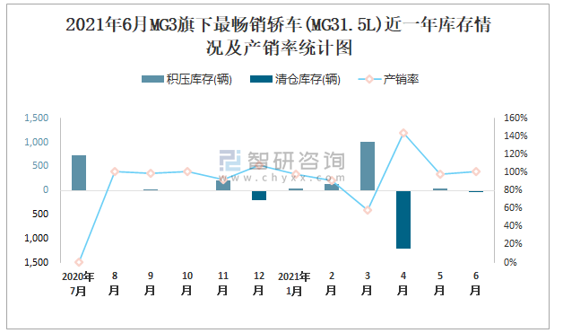 2021年6月MG3旗下最暢銷車(MG31.5L)近一年庫存情況及產銷率統計圖