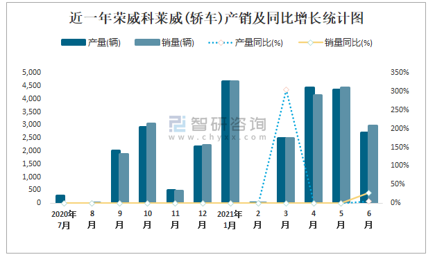 根據中國汽車工業協會數據可知:2021年6月榮威科萊威(轎車)產量為2715輛,同比增長5.4%,銷量為2958輛,同比增長27.7%,當月產銷率為108.95%;2021年上半年榮威科萊威(轎車)產量為18685輛,同比增長390.4%,銷量為18693輛,同比增長432.6%,產銷率為100.04%;且2020年榮威科萊威(轎車)總產量大于總銷量,積壓了庫存30輛。