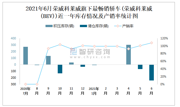 2021年6月榮威科萊威旗下最暢銷車(榮威科萊威(BEV))近一年庫存情況及產銷率統計圖
