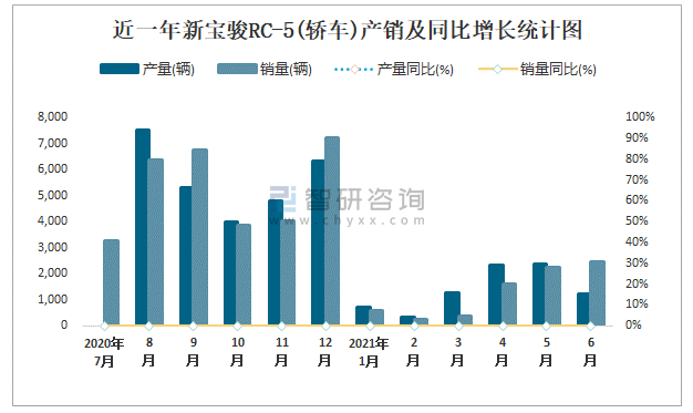 根據中國汽車工業協會數據可知:2021年6月新寶駿RC-5(轎車)產量為1225輛,同比下降0%,銷量為2447輛,同比下降0%,當月產銷率為199.76%;2021年上半年新寶駿RC-5(轎車)產量為8217輛,同比下降0%,銷量為7440輛,同比下降0%,產銷率為90.54%;且2020年新寶駿RC-5(轎車)總產量大于總銷量,積壓了庫存141輛。