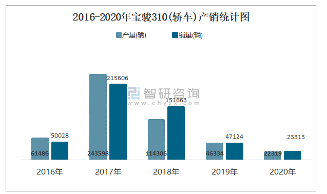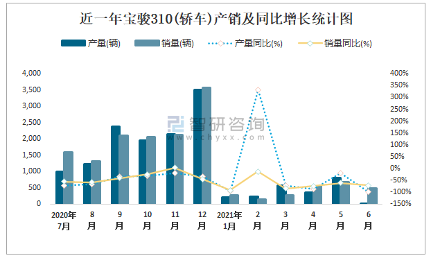 根據中國汽車工業協會數據可知:2021年6月寶駿310(轎車)產量為1輛,同比下降99.9%,銷量為474輛,同比下降72%,當月產銷率為47400%;2021年上半年寶駿310(轎車)產量為2158輛,同比下降78.7%,銷量為2375輛,同比下降77.6%,產銷率為110.06%;2016-2020年寶駿310(轎車)產銷量均在2017年達到最高值,此后逐年遞減,且近5年總產量大于總銷量,積壓了庫存309輛。