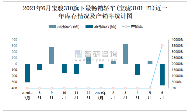 2021年6月寶駿310旗下最暢銷車(寶駿3101.2L)近一年庫存情況及產銷率統計圖