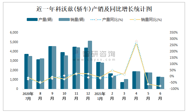根據(jù)中國(guó)汽車工業(yè)協(xié)會(huì)數(shù)據(jù)可知:2021年6月科沃茲(轎車)產(chǎn)量為1257輛,同比下降75.9%,銷量為1217輛,同比下降77.8%,當(dāng)月產(chǎn)銷率為96.82%;2021年上半年科沃茲(轎車)產(chǎn)量為9930輛,同比下降30%,銷量為9884輛,同比下降34.3%,產(chǎn)銷率為99.54%;2016-2020年科沃茲(轎車)產(chǎn)銷量均在2018年達(dá)到最高值,此后逐年遞減,且近5年總產(chǎn)量大于總銷量,積壓了庫(kù)存54輛。