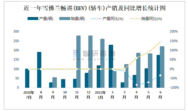 根據中國汽車工業協會數據可知:2021年6月雪佛蘭暢巡(BEV)(轎車)產量為174輛,同比下降34.1%,銷量為219輛,同比增長146.1%,當月產銷率為125.86%;2021年上半年雪佛蘭暢巡(BEV)(轎車)產量為712輛,同比下降34%,銷量為1056輛,同比增長79.3%,產銷率為148.31%;且2020年雪佛蘭暢巡(BEV)總銷量大于總產量,清倉庫存16輛。