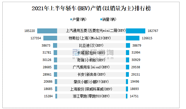 2021年上半年轎車(BEV)產銷(以銷量為主)排行榜