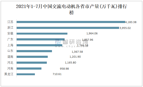 根據國家統計局數據顯示:2021年各季度(第三季度暫只統計7月數據)中國交流電動機主要集中在華東、華中、華北地區生產;2021年1-7月中國交流電動機產量大區分布不均衡,其中華東地區產量最高,特別是江蘇省貢獻了最多產量;2021年1-7月中國交流電動機各省市產量呈現梯隊式分布,江蘇、浙江等省產量最多。