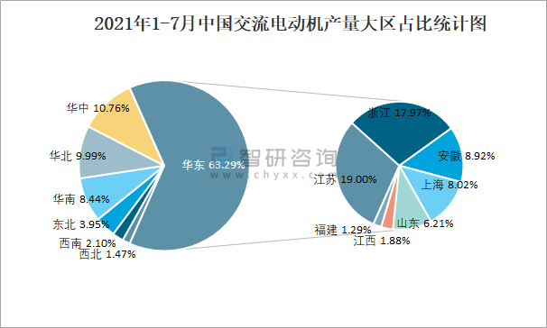 2021年1-7月中國交流電動機產量大區占比統計圖