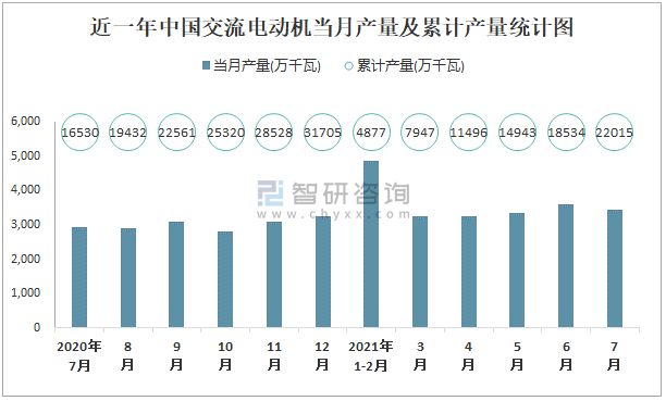 根據國家統計局數據顯示:2021年7月中國交流電動機產量為3454萬千瓦,同比增長2.8%;2021年1-7月中國交流電動機累計產量為22015.1萬千瓦,累計增長25.8%;2015-2020年中國交流電動機產量2018年跌至最低,此后逐年遞增。