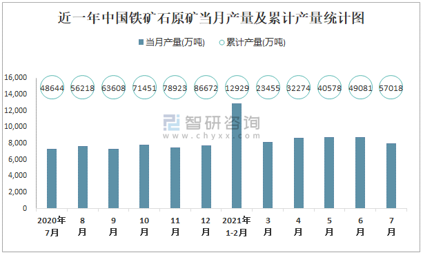根據國家統計局數據顯示:2021年7月中國鐵礦石原礦產量為7993萬噸,同比增長4.9%;2021年1-7月中國鐵礦石原礦累計產量為57018萬噸,累計增長14.5%;2015-2020年中國鐵礦石原礦產量2018年跌至最低,此后逐年遞增。