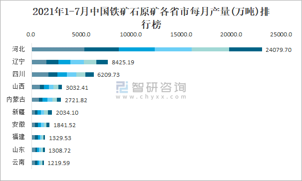 2021年1-7月中國鐵礦石原礦各省市每月產量排行榜
