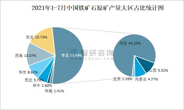 2021年1-7月中國鐵礦石原礦產量大區占比統計圖