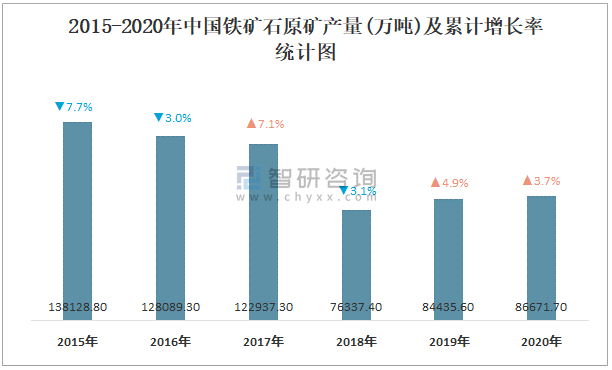 2015-2020年中國鐵礦石原礦產量及增長率統計圖