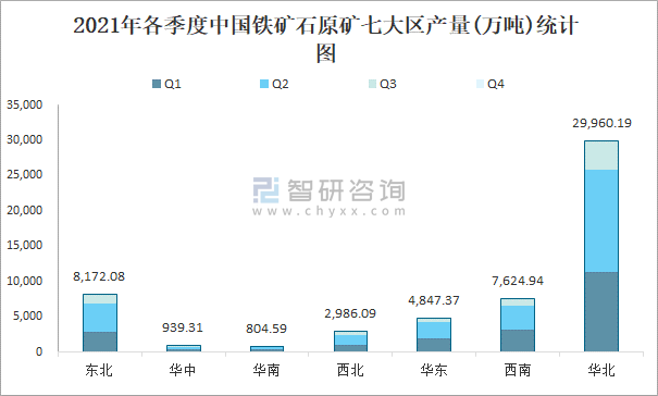 2021年各季度中國鐵礦石原礦七大區產量統計圖