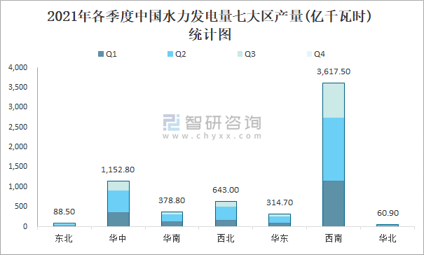 根據國家統計局數據顯示:2021年各季度(第三季度暫只統計7月數據)中國水力發電量主要集中在西南、華中、西北地區生產;2021年1-7月中國水力發電量產量大區分布不均衡,其中西南地區產量最高,特別是四川省貢獻了最多產量;2021年1-7月中國水力發電量各省市產量呈現梯隊式分布,四川、云南等省產量最多。